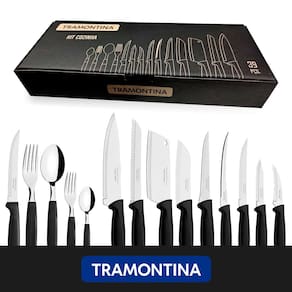 Quem preza por uma cozinha completa, com itens que tornem o preparo das receitas e a hora de saboreá-las ainda mais prático, precisa conhecer o kit cozinha Tramontina com lâminas em aço inox e cabos de polipropileno preto 39 peças. Composto por peças perfeitas para lhe acompanhar diariamente, como facas, cutelo e talheres de mesa, ele vai deixar suas atividades na cozinha muito mais práticas e eficientes. Elas são produzidas com lâminas em aço inox, onde as facas tem aplicação de tratamento térmico que oferece maior poder de corte e durabilidade em seu fio e os garfos e colheres contam com maior resistência devido a estampagem e espessura do aço. Todos os cabos são em polipropileno, têm formato que proporcionam um manuseio mais seguro, pois garantem maior firmeza. Além de todas essas características, as peças do kit podem ser levadas à máquina de lavar louças, levando maior facilidade para seu dia a dia na cozinha. Escolha Tramontina e veja sua casa e sua cozinha serem transformadas!