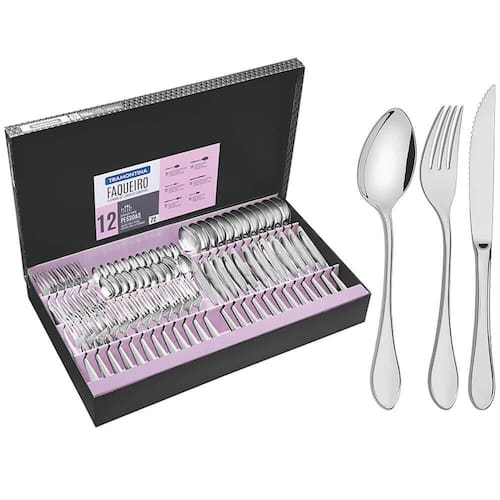 DESCRIÇÃO DO FAQUEIRO TRAMONTINA EM AÇO INOX COM FACAS PARA CHURRASCO FORJADAS ALTO BRILHO 72 PEÇAS - Deixe a sua mesa com uma elegância única com o Faqueiro Tramontina em Aço Inox com Facas para Churrasco Forjadas 6mm Acabamento Alto Brilho 72 Peças. - Um belíssimo jogo da linha Italy que oferece colheres com bojo em formato simétrico e bordas cuidadosamente arredondadas. - Garfos com dentes polidos na parte interna, com formato apropriado para a boca e bordas arredondadas para proporcionar maior conforto no uso. - Facas de fio serrilhado totalmente temperadas, que garantem maior durabilidade no fio de corte e maior resistência à corrosão, e por suas características de temperabilidade, não riscam as porcelanas. - As peças são totalmente desenvolvidas em aço inox, altamente duráveis, mantendo suas características autênticos por mais tempo. - Além disso, terá a oportunidade de levar para o seu almoço, jantar ou churrasco toda a beleza de um acabamento em alto brilho.