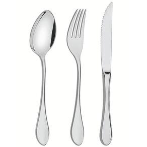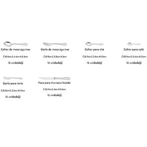 CONTEÚDO DO JOGO - 12 Colher de mesa aço inox - 12 Colher para café - 12 Colher para chá - 12 Faca para churrasco forjada - 12 Garfo de mesa aço inox - 12 Garfo para torta