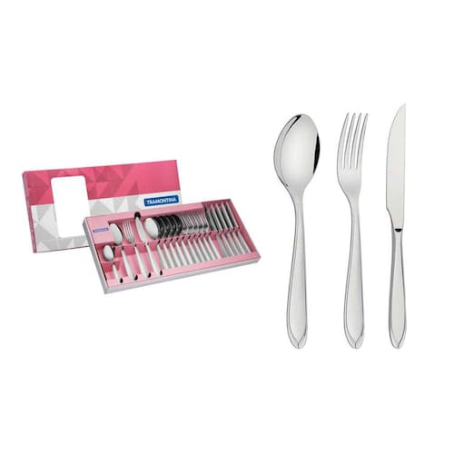 Tenha produtos de bom gosto na sua cozinha. O Faqueiro para Churrasco Tramontina Laguna em Aço Inox 24 Peças é um conjunto completo para as necessidades que você encontrar. Ideais para uso diário, as 24 peças se encaixam em qualquer ambiente e em diferentes momentos. Possuem a qualidade do aço inox e um charmoso acabamento em brilho, que embeleza sua mesa. O visual ainda impressiona pelos detalhes no cabo de cada talher. São produtos versáteis que facilitam também na hora da limpeza, podendo ser lavados diariamente na máquina de lavar louças. Os utensílios apresentam características únicas e pensadas para você. Os garfos possuem dentes polidos na parte interna, com formato apropriado para a boca e bordas arredondadas, proporcionando maior conforto no uso. As colheres com bojo tem formato simétrico e bordas cuidadosamente arredondadas. As facas são totalmente temperadas, garatindo maior durabilidade no fio de corte e maior resistência à corrosão. Elas ainda preservam as louças, já que não riscam as porcelanas. O faqueiro ainda traz facas especiais para churrasco, tornando os momentos em volta da churrasqueira mais saborosos. Peças totalmente feitas de aço inox, altamente duráveis, mantêm suas características originais, preservando a beleza, a higiene e a durabilidade do material. Colheres com bojo em formato simétrico e bordas cuidadosamente arredondadas. Garfos com dentes polidos na parte interna, com formato apropriado para a boca e bordas arredondadas para proporcionar maior conforto no uso. Facas totalmente temperadas, que garantem maior durabilidade no fio de corte e maior resistência à corrosão, e por suas características de temperabilidade, não riscam as porcelanas. Acabamento em brilho, com detalhes no cabo. Próprias para uso diário combinam com qualquer ambiente. Podem ser lavadas diariamente na máquina de lavar louças. Observações Durante a lavagem, use apenas sabão ou detergente e uma esponja macia. Outros tipos de produtos como palha de aço, poderão riscar ou prejudicar o brilho dos talheres. Enxágue bem cada peça a fim de remover totalmente os resíduos dos produtos de limpeza,pois, por serem abrasivos, podem prejudicar o inox. Sempre que possível, use água quente, pois renova o brilho do talher. Após a lavagem, enxugue imediatamente os talheres, caso contrário, as substâncias químicas da água (cloro) poderão causar manchas.Evite atrito entre os talheres durante o processo de lavagem e no armazenamento, para mantê-los sem riscos. Evite o contato das peças com superfícies quentes. Elas provocam a descoloração do produto. Não guarde os talheres em locais úmidos. A umidade também provoca manchas. Ao usar a lava-louça, recomendamos retirar os talheres logo que tenha terminado o ciclo ''enxaguar'', a fim de que sejam secados manualmente. Características Gerais EAN13 7891116062449 DUN14 17891116062446 NCM 8215.20.00 Peso Líquido 0,7740 kg. Peso Bruto 1,0040 kg. Metragem 0,003983 m³. Dimensões Embalagem (Compr. X Larg. X Alt.) 468x 230x 37 mm.