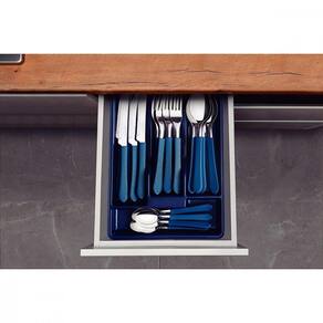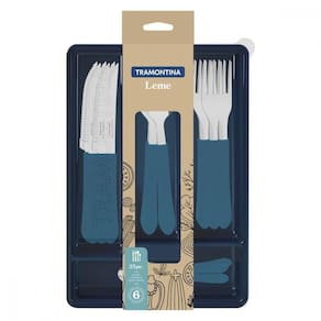 Lâminas de aço inox. As lâminas das facas têm maior durabilidade do fio devido ao tratamento térmico. Os garfos e colheres garantem maior resistência devido a espessura do aço e a estampagem das lâminas. Os cabos de polipropileno possuem maior resistência e durabilidade. Podem ir à máquina de lavar louças facilitando seu dia a dia.