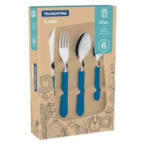 Com o Faqueiro Tramontina Leme com Lâminas em Aço Inox e Cabos de Polipropileno Azul Oceano 24 Peças você irá garantir uma mesa muito mais moderna e refeições muito mais saborosas. Suas peças tem lâminas produzida em aço inox e contam com cabos desenvolvidos em polipropileno, ambas características que proporcionam maior durabilidade e resistência. Ele vem na cor azul oceano e deixa sua mesa muito mais colorida, o que ajuda na hora de satisfazer a todos no momento da refeição. É ainda muito fácil de limpar e pode ser higienizado na máquina de lavar louças. A escolha perfeita para o seu dia a dia! Orientações Lâminas de aço inox. As lâminas das facas têm maior durabilidade do fio devido ao tratamento térmico. Os garfos e colheres garantem maior resistência devido a espessura do aço e a estampagem das lâminas. Os cabos de polipropileno possuem maior resistência e durabilidade. Podem ir à máquina de lavar louças facilitando seu dia a dia. Observações Antes da primeira utilização, lave bem as peças e seque-as.Tenha cuidado ao manusear produtos cortantes e perfurantes e mantenha-os fora do alcance das crianças.Para maior durabilidade dos produtos recomenda-se secar bem antes de guardar, mesmo após lavagem em máquina. Para descarte dos produtos e embalagens siga as orientações de reciclagem vigentes. Características Gerais EAN13 7891112282094 DUN14 17891112282091 NCM 8215.20.00 Peso Líquido 0,4500 kg. Peso Bruto 0,6100 kg. Metragem 0,003044 m³. Dimensões Embalagem (Compr. X Larg. X Alt.) 455x 223x 30 mm. Cor 1 005F86 Hexa