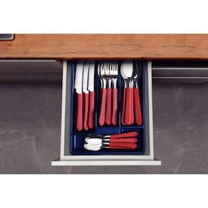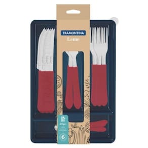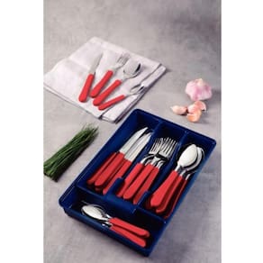 - Marca: Tramontina - Lâminas de aço inox. - As lâminas das facas têm maior durabilidade do fio devido ao tratamento térmico. - Os garfos e colheres garantem maior resistência devido a espessura do aço e a estampagem das lâminas. - Os cabos de polipropileno possuem maior resistência e durabilidade. - Gaveteiro ideal para armazenar e guardar os talheres na gaveta. - Podem ir à máquina de lavar louças facilitando seu dia a dia. - Peso da embalagem: 470 gr - Garantia: 90 dias para vícios ou defeitos de fabricação.