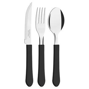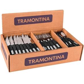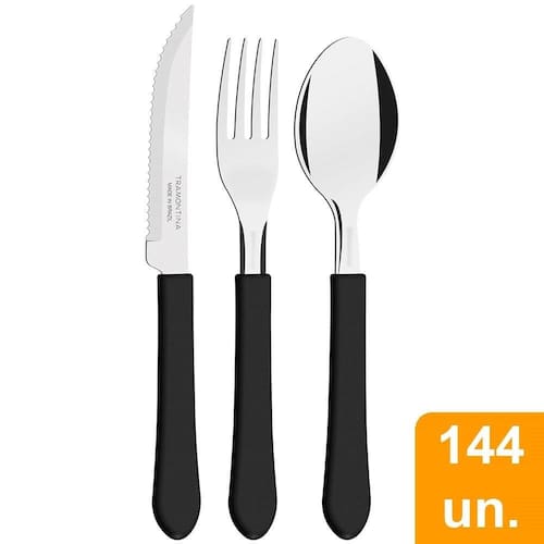 Características do Produto:<br/>Cor: Cabo em Polipropileno Preto e Lâminas em Inox<br/>Marca: Tramontina<br/>Modelo: Leme 144 Peças<br/>Sessão: Faqueiro<br/>Lâminas em aço inox.<br/>Cabos de polipropileno.<br/><br/>Informações Adicionais do produto:<br/>Lâminas de aço inox<br/>As lâminas das facas têm maior durabilidade do fio devido ao tratamento térmico <br/>Os garfos e colheres garantem maior resistência devido a espessura do aço e a estampagem das lâminas <br/>Os cabos de polipropileno possuem maior resistência e durabilidade<br/>Podem ir à máquina de lavar louças facilitando seu dia a dia<br/><br/>Orientações:<br/>Tenha cuidado ao manusear produtos cortantes e perfurantes e mantenha-os fora do alcance das crianças<br/>Para maior durabilidade dos produtos recomenda-se secar bem antes de guardar, mesmo após lavagem em máquina<br/><br/>Composição do Jogo de Talheres:<br/>72 facas para churrasco <br/><br/>48 garfos de mesa <br/><br/>24 colheres de mesa<br/><br/>Dimensões Embalagem:<br/>(Compr. X Larg. X Alt.): 40,0 x 22,0 x 9,5 cm<br/><br/>Pesos:<br/>Peso Líquido: 2,9900 kg<br/>Peso Bruto: 3,2550 kg<br/><br/>Garantia: 3 Meses ( ofertada pelo fornecedor)<br/><br/><span style=''color:#ee1d24;''>"A Embalagem deste Produto é Caixa Parda"</span><br/><br/>Fornecedor: Tramontina;