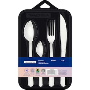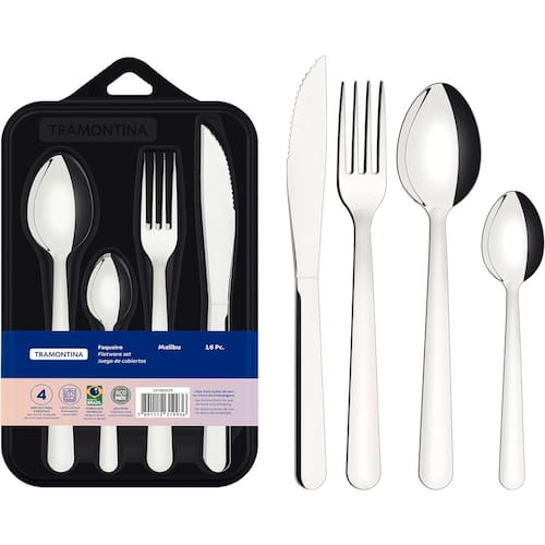 ocê não abre mão de uma mesa posta para suas refeições diárias? Então, precisa conhecer o faqueiro Tramontina Malibu em aço inox 16 peças. Composto por talheres que vão deixar sua mesa muito mais encantadora, ele garante ainda alta resistência e durabilidade. Ele é produzido em aço inox e conta com facas de alto poder de corte, devido ao tratamento térmico e garfos e colheres resistentes a impactos, já que possuem estampagem e espessura especiais. Um jogo que pode ir à máquina de lavar louças e que vai facilitar suas tarefas na cozinha!