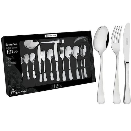 - O Faqueiro Tramontina em Aço Inox com Facas de Mesa Acabamento Alto Brilho com Detalhes no Cabo 101 Peças da linha Mônaco possui muitas qualidades.