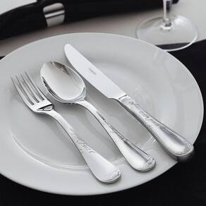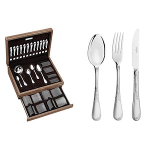O Faqueiro Renascença se destaca pelo seu design sofisticado com acabamento em brilho e fosco, além de detalhes em alto relevo nos cabos. As peças são feitas de aço inoxidável, garantindo durabilidade e resistência à corrosão, e as facas possuem lâminas temperadas que não riscam porcelanas.