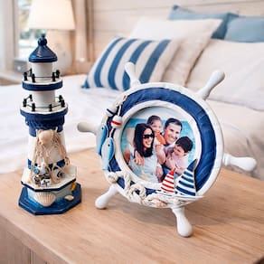 Deixe sua decoração com o charme do estilo náutico! O Kit Farol com Porta-Retrato é perfeito para quem ama o tema marítimo e quer transformar qualquer ambiente com elegância e personalidade