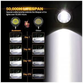 Padrão de feixe combinado e espalhado. A luz de condução redonda do Auxbeam de 50W apresenta um padrão de feixe combinado, com refletores Spot Spread perfeitamente angulados, para máxima distância à frente e iluminação periférica aprimorada ao longo das bordas da estrada