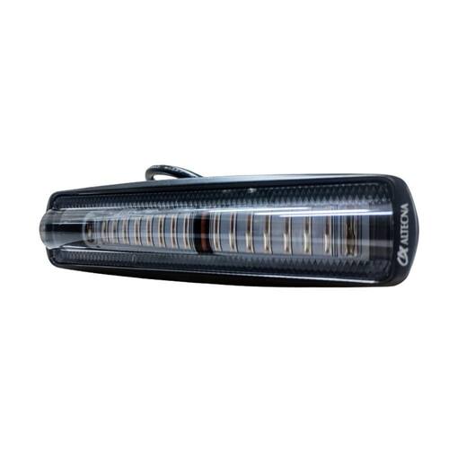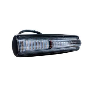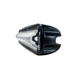 Esse farol possui a tecnologia Red Zone, que utiliza 15 LEDs focados para marcação. O feixe de luz é vermelho, e o acabamento é na cor preta. O material utilizado é o alumínio fundido, garantindo resistência e durabilidade ao produto. As lentes são feitas em policarbonato, e a base de fixação é de metal.