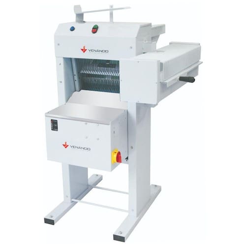 Equipamento ideal para fatiar e descascar pães, a Fatiadeira conta com estrutura em aço SAE 1020 com acabamento em pintura a pó eletrostática com base fosfatizada, mesa revestida em aço inox e motor monofásico de 1/4CV com opcão de tensão de 127V ou 220V.