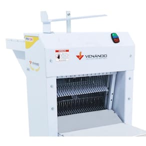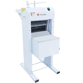 Esse Fatiador de Pães efetua cortes com 12mm de espessura com suporte para facilitar a embalagem dos pães e gaveta inferior que recolhe migalhas do corte. Possui dois conjuntos de 14 lâminas de corte confeccionadas em aço carbono 1095 super-resistente.