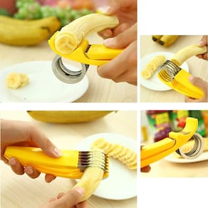 Cortador e fatiador de banana, faz rodelas de banana ideais para complementar um lanche rápido e saudável, para fazer salada de frutas e para o que mais sua imaginação permitir.