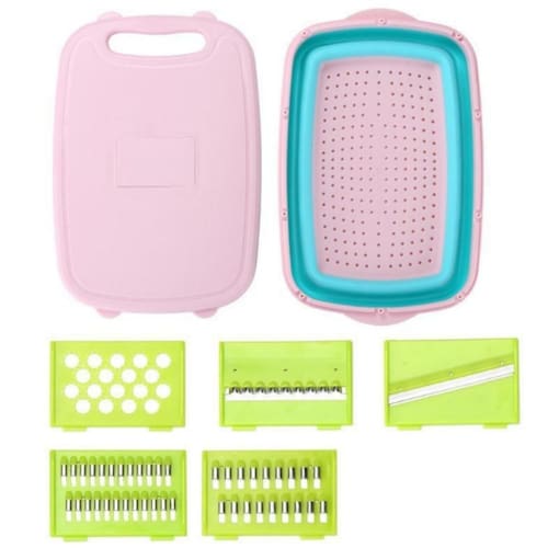 Fatiador de legumes multifuncional com 4 bicos intercambiveis, tbua de corte, ralador, cesto dobrvel, recipiente para alimentos com funo de drenagem, faca de cozinha e cortadora de frutas.
