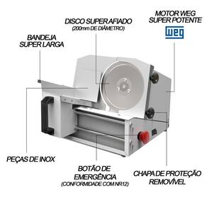 Esse Cortador de Frios Elétrico conta com estrutura 100% de metal, possui motor de alta tecnologia e sistema RED-PLUS, capaz de aumentar a vida útil do motor e diminuir a sua manutenção.