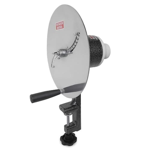 Acompanha dois discos ambos com duas facas em inox totalmente afiadas para melhor resultado em seu corte. Seu funcionamento é muito simples, basta inserir a batata no bocal indicado girar a manivela e pronto. Acompanha as duas opções de corte: Batata Chips e Batata palhas - troca de disco é feito manualmente.