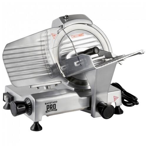 O Fatiador de Carne Manual Backyard Pro SL109E Butcher Series 9 é ideal para cortes ocasionais de ingredientes frescos na cozinha. Fabricado em alumínio resistente, possui afiador de lâmina embutido e protetor de anel fixo para segurança. Com design de 110V e 120W, é perfeito para uso em cafeterias, pizzarias, buffets e restaurantes de pequeno porte. Fácil de limpar e manter, com bandeja de aço inoxidável. Versátil e seguro para uso diário.