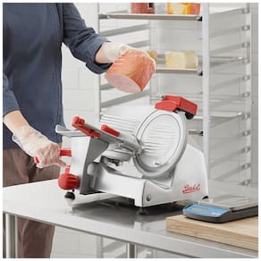 A Fatiadora de Carne Manual Berkel B9SLC é perfeita para operações de baixo volume, ideal para pequenos estabelecimentos. Seu motor de 1/4 hp e mesa de 76 cm lidam facilmente com cortes grandes. Com lâmina de aço carbono de 23 cm, consegue fatiar com precisão até 2,4 cm de espessura. Possui afiador de faca de duas pedras, desmontagem fácil para limpeza sem ferramentas e anel de proteção. Construída em aço inoxidável durável, oferece limpeza rápida e durabilidade. Segura e eficiente, é a escolha ideal para seu negócio!