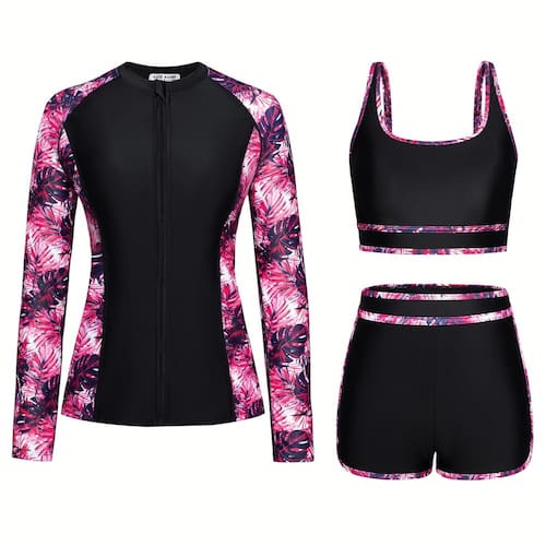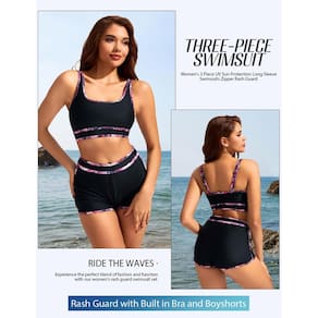 - Fatos de banho femininos de 3 peças de qualidade premium: este traje de banho rash guard feminino inclui um top de natação de manga comprida, uma regata com um sutiã embutido e shorts de natação, proporcionando proteção completa e conforto para suas atividades aquáticas. A blusa de manga comprida é projetada com zíper frontal e gola redonda, enquanto a regata possui bainha elástica com gola em U e bojos removíveis para suporte adicional. O short de natação com cintura elástica garante um ajuste confortável e permite total amplitude de movimento.