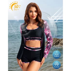 - 3 peças Rash Guard femininas: nossos trajes de banho femininos incluem uma camisa de natação de manga comprida, uma regata com um sutiã removível embutido e um short de natação com controle de barriga de cintura alta, oferecendo proteção completa e conforto para suas atividades aquáticas