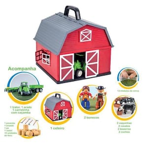 Fazendinha 8192 Poliplac Fazendinha 8192 Poliplac .A Fazendinha Poliplac é ideal para brincar e aprender de forma lúdica a rotina da fazenda.O Celeiro grande em estilo americano comporta todos os itens da fazenda em seu interior e possui abertura de portas, janelas e telhado.A Fazendinha é composta por :1 celeiro, 2 bonecos fazendeiros, 1 trator, 1 arado, 1 carretinha, 4 ferramentas manuais, 2 vaquinhas, 2 cavalos, 2 bezerros, 2 cochos, 12 módulos de cerca e 10 rolos de feno.Desenvolve a coordenação motora.Estimula a concentração e a imaginação.Amplia a capacidade de percepção.Desenvolve a interação com o meio.Ideal para atividades individuais ou em grupo. Características GeraisMaterial: PlásticoRebanho: Vaquinhas, Cavalos e Bezerros com a cabeça articulávelBonecos Fazendeiro: Bonecos Fazendeiro com pernas, braços mãos e cabeça articuláveisFerramentas: Pá, enxada, rastel e picareta que encaixa nas mãos dos bonecosIdade recomendada: +3 anosDimensões: 37,5 cm x 38,4 cm x 40 cmInmetro: IQB 0006 Registro 005341/2021