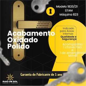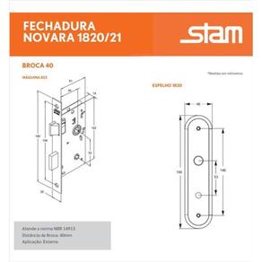 Ficha Técnica: Fabricante: Stam Norma: 14913 Máquina: 823 Distância de Broca: 40mm Aplicação: Banheiro Tráfego: Leve Segurança: Média Acessórios: Tranqueta, chave reserva, maçanetas, espelhos, contra testa Composição: Aço ABNT 1010/1020, Zamac, Aço Inox, Latão, Plástico de Engenharia Espelho: Aço ABNT 1010/1020 Maçaneta: Zamac 5 Testa: Aço Inox 430 Contra Testa: Aço Inox 430 Linha: Novara 1801 Nível de Corrosão: 1 Chave fixa no espelho de 1 lado Acabamento: Oxidado Espessura da Porta: 25mm até 40mm Marca: Não Informado