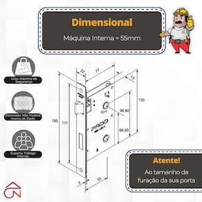 Além disso, sua máquina de 55mm proporciona maior segurança anti arrombamento e conforto no pegar a maçaneta, sendo a opção ideal para locais de alto fluxo de pessoas como clinicas, comercios, áreas médicas e residências de alto padrão já que possui máxima resistência à Tráfego!