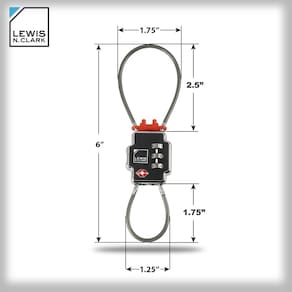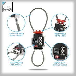 Trava de segurança tripla Lewis N Clark, Preto, Compacto - TRIPLA SEGURANÇA: trave os puxadores do zíper juntos, trave a alça da bagagem nos puxadores do zíper ou trave sua bagagem em objetos fixos, evitando que ladrões consertem zíperes após entrar na bagagem. Observação: meça o traseiro, o furo transversal e a espessura da sua porta para garantir que você encontre o ajuste certo. - Compatível com TSA: este cadeado TSA permite que os agentes TSA tenham acesso fácil à sua mala ou malas despachadas sem danificar qualquer uma das suas bagagens ou quebrar zíperes - Adicione uma bolsa: prenda rapidamente e facilmente sua bolsa de laptop, bolsa, bolsa de fraldas ou bolsa de higiene à sua bagagem para maior segurança. A melhor trava para férias, viagem de negócios ou mochila. Oferece tranquilidade! - Combinação sem chave: o cadeado de combinação de 3 mostradores com combinação de mostrador redefinível é o melhor cadeado sem chave do mercado e oferece acesso rápido à sua bagagem (sem chaves perdidas) - Durável: estrutura de liga de zinco fundido resistente com invólucro de plástico ABS e dois cabos de aço trançados. Esta trava resistente levará uma surra e protegerá sua bagagem de qualquer ladrão em potencial