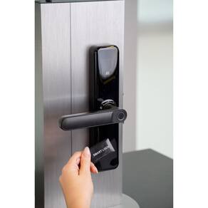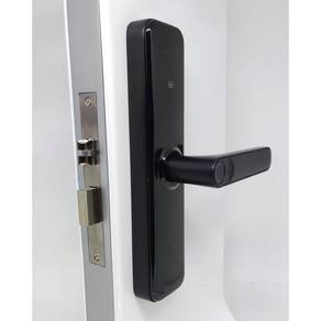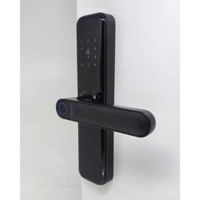 Fechadura com abertura por biometria, senha, cartão e aplicativo. Modelo ideal para portas de madeira ou metal, com visual discreto na cor preta.