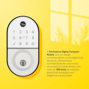 Fechadura Digital Compact Branca Rolete - Yale A Fechadura Digital Compact da Yale é uma opção moderna e segura para quem busca praticidade e tecnologia. Obs: Somente a lado externo da fechadura (painel com display) pode ficar exposto ao tempo. - Espessura de Porta: 35 a 70mm - Até 250 Senhas - Até 250 Biometrias - Até 250 Tags - Guia de Voz 3 idiomas: Inglês, Espanhol e Português - 4 Pilhas AA alcalinas autonomia de até 3.600 acionamentos - Resistente a intempéries. Somente a lado externo da fechadura (painel com display) pode ficar exposto ao tempo. - Garantia do fabricante: 24 meses - Tipos de abertura: Senha numérica, biometria, cartão e chave de segurança