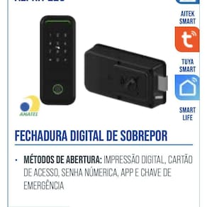Descrição Fechadura Digital Biométrica de Sobrepor - Segurança, Tecnologia e Praticidade A Fechadura Digital Biométrica de Sobrepor é a escolha ideal para quem valoriza segurança, modernidade e praticidade no controle de acesso. Com design sofisticado e tecnologia de ponta, ela oferece múltiplas formas de desbloqueio, garantindo máxima proteção para residências, escritórios e estabelecimentos comerciais. Métodos de Abertura Impressão Digital: Sensor biométrico de alta precisão com capacidade para cadastrar até 50 digitais. Permite desbloqueio rápido e seguro com um simples toque. Cartão de Aproximação RFID : Compatível com cartões MI e IC. Basta aproximar o cartão para destravar a fechadura, dispensando o uso de chaves. Senha Numérica: Acesso via teclado touch com função de código embaralhado para evitar visual. Chave Mecânica de Emergência: Garante acesso mesmo em casos de falha de bateria ou imprevistos. Principais Características Instalação de Sobrepor: Fácil instalação, sem necessidade de grandes adaptações na porta. Compatível com diversos materiais e modelos. Alimentação por Pilhas: Funciona com 4 pilhas AA não inclusas , com autonomia média de até 6 meses aproximadamente 7.000 desbloqueios . Alimentação de Emergência: Entrada USB Tipo-C para conexão de fonte externa em caso de pilhas descarregadas. Cadastro de Usuários: Suporta até 250 usuários, sendo 50 digitais, 200 senhas e cartões combinados. Ideal para famílias, empresas e pequenos negócios. Fechamento Automático: Trava a porta automaticamente após alguns segundos de inatividade, aumentando a segurança. Modo Passageiro: Permite deixar a porta destravada temporariamente em ambientes de alta circulação. Material Durável e Sofisticado: Estrutura resistente em liga de alumínio e plástico ABS, com acabamento elegante. Sinalização Sonora e Visual: LEDs e alertas sonoros indicam ações como abertura, fechamento e tentativas inválidas. Compatibilidade Universal: Pode ser instalada em portas de vidro, madeira, metal, alumínio e portas de correr. Especificações Técnicas Métodos de Acesso: Impressão digital, senha numérica, cartão de aproximação, chave de emergência Compatibilidade com Sistema Operacional: iOS 7.0 ou superior / Android 4.4 ou superior Capacidade de Cadastro: 50 digitais, 200 senhas/cartões até 250 usuários Tempo de Desbloqueio: Aproximadamente 3 segundos Fonte de Alimentação: 4 pilhas alcalinas AA 6V Alimentação de Emergência: USB Tipo-C 5V Duração da Bateria: Cerca de 6 meses com uso regular Espessura Compatível da Porta: o Portas de vidro sem moldura: 8-12 mm o Portas de vidro com moldura: moldura de até 47 mm necessita placa de reforço para vidros de 4-10 mm Tipo de Sensor Biométrico: Semicondutor Conectividade: Bluetooth para senhas temporárias Wi-Fi opcional Temperatura Operacional: -25C a 65C Umidade Operacional: Até 95% UR Corrente Estática: 120 A Corrente Dinâmica: 200 mA Senha Padrão de Fábrica: 123456 deve ser alterada na primeira configuração Senha de Disfarce: Suporte a senhas de até 32 dígitos para maior segurança Direção de Abertura: Universal esquerda ou direita Dimensões: o Painel Externo: 72 x 179 mm o Painel Interno: 167,5 x 88,5 mm Peso: 1,15 kg Materiais: Liga de alumínio, ABS e componentes eletrônicos Conteúdo da Embalagem 1 Painel Interno 1 Painel Externo 1 Bateria 2 Cartões de Aproximação RFID 2 Chaves Mecânicas de Emergência 1 Kit de Instalação parafusos e suportes 1 Manual de Instruções em Português Conclusão A Fechadura Digital Biométrica de Sobrepor oferece o equilíbrio perfeito entre segurança, tecnologia e comodidade. Com múltiplas formas de acesso, instalação prática e recursos inteligentes, ela é ideal para quem busca modernizar o controle de entrada com eficiência e estilo.
