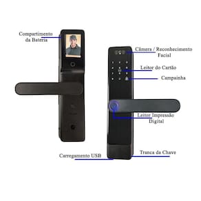 A fechadura possui aviso de bateria fraca e abertura mecânica através de chave.