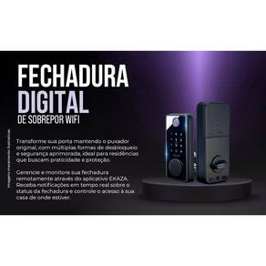 Fechadura Inteligente WiFi Sobrepor Biometria Tag Ekaza Tuya Fechadura Inteligente Wi-Fi de Sobrepor Ekaza - Controle e Segurança Avançados Proteja e automatize sua casa com a Fechadura Inteligente Wi-Fi EKDS-T328 da Ekaza. Com um design robusto e tecnologia avançada, ela oferece segurança, praticidade e controle completo do acesso ao seu ambiente interno. Principais Características Acesso Remoto: Controle e monitore a fechadura de qualquer lugar via aplicativo Tuya ou Ekaza. Múltiplos Métodos de Desbloqueio: Código de Acesso: Crie e gerencie senhas personalizadas para familiares e visitantes. Cartões RFID: Acesso rápido e prático com os cartões inclusos. Chave Física: de desbloqueio em situações de emergência. Segurança Avançada: Receba notificações em tempo real sobre tentativas de acesso forçado. Especificações Técnicas Marca: Ekaza Modelo: EKDS-T328 Conexão: Wi-Fi 2.4 GHz Material: Construção robusta e durável Alimentação: Pilhas Compatibilidade: Totalmente integrado aos sistemas de automação residencial via app Tuya ou Ekaza Direção de abertura: Direita/Esquerda Ambiente de uso: Interno Espessura mínima da porta recomendada: 25 mm Espessura máxima da porta recomendada: 50 mm Quantidade de cartões suportados: 100 Quantidade de códigos numéricos suportados: 100 Homologação Anatel Nº 40042011765 Quantidade máxima de impressões digitais: 100 Com indicador de bateria fraca Aplicativos: Ekaza, Android, Tuya, Smart Life e NovaDigital. : 12 meses contra defeitos de fabricação da Ekaza. Conteúdo da Embalagem 1x Fechadura Inteligente EKDS-T328 2x Cartões RFID 1x Manual de Instruções 1x Chave Física Controle e Monitoramento Inteligente A Fechadura EKDS-T328 é a escolha ideal para quem busca segurança aliada à praticidade. Com múltiplas formas de acesso e monitoramento em tempo real, ela é perfeita para residências, escritórios e estabelecimentos comerciais. Transforme a segurança do seu ambiente com a tecnologia da Fechadura Inteligente Ekaza. Garanta já a sua e proteja seu lar com eficiência e modernidade Necessário ter ou providenciar a rede Wi-fi 2,4GHz, com alta capacidade interna para administração de dispositivos e com boa distribuição do sinal no local. Com a oscilação na conexão do dispositivo, pode acarretar falha na resposta aos comandos via aplicativo, assistentes de voz e não execução de rotinas automáticas agendadas . Consulte um técnico da sua operadora.