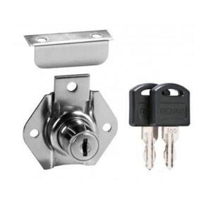 Material: Aço Niquelado Rotação da chave: 180 Tipo de chave: Fixa com acabamento Plástico preto Contém: uma fechadura e kit com duas chaves e batente. Dimensões: 16x22mm Imagem meramente ilustrativa Marca: Não Informado