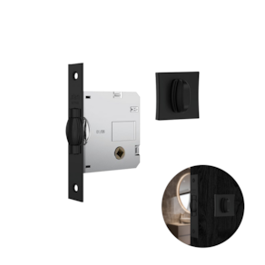 Marca: Stam Modelo: 1025 – Pivotante Tipo: Fechadura para banheiro Uso indicado: Portas internas pivotantes Acabamento: Black Rosetas: Quadradas, sem parafusos aparentes Máquina: 45 mm Material: Alta resistência e durabilidade Maçaneta: Não possui (fechadura sem maçaneta)
