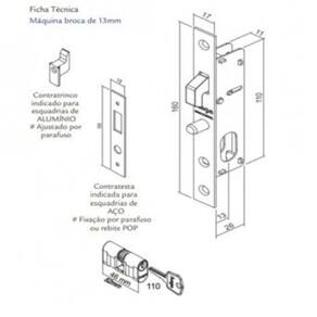 Roseta: 426 em Aço Carbono Cilindro: 110 Broca: 13 mm Contra Testa: Ref. 1764 - 2 furos ContraTrinco: em Zamac Obs: ContraTrinco indicado para esquadrias de Alumínio - Ajustado por parafuso