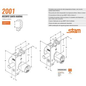 Fechadura Porta Vidro 2001 Santa Marina Redonda Cromada Características: Máquina: 2001 Aplicação: portas de vidro temperado de bater com recorte padrão santa marina Portas de vidro temperado: espessuras 8mm, 10mm e 12mm O cilindro bi-partido é feito em zamac 5 Chaves em latão com acabamento niquelado Matéria prima: aço abnt 1010 - zamac - aço inox - latão Ean: 7893858222563