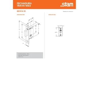 TRAVA 1003 EI Torne suas portas mais seguras com a qualidade das travas auxiliares Stam. Mais segurança e qualidade para o mais importante. APLICAÇÃO TETRA EXTERNA ACABAMENTO INOX POLIDO INFORMAÇÕES ADICIONAIS Máquina 1003 Distância de Broca 18 mm Aplicação Tetra Externa Acessórios Chave, espelho, contra testa Composição Aço ABNT 1010, Zamac, Aço Inox, Latão, Plástico de Engenharia Espelho Aço ABNT 1010/1020 Testa Aço ABNT 1010/1020 Contra Testa Aço ABNT 1010/1020 Linha Auxiliar Embalagem Caixa Ean: 7893858100359