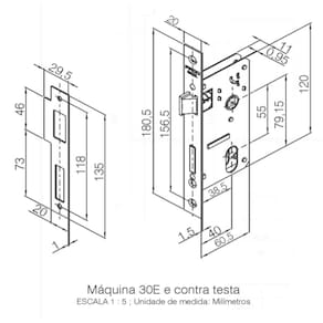 Máquina para porta externa 30e (testa fixa) Broca de 40mm Tráfego médio Grau de segurança média Sistema de reversão do trinco sem necessidade de ferramentas Caixa e tampa em aço galvanizado Trinco e lingueta em zamac pintado de preto Testa e contra testa em aço inoxidável pintado de preto