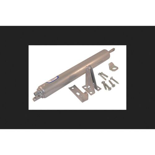 Fecho de porta de alumínio pneumático em prata; Nome da marca: BARTON KRAMER Cor: Prata Material: Alumínio Mecanismo: Pneumático Tipo de produto: Fecho de porta Tipo de embalagem: Cardado Velocidade de fechamento ajustável: Sim Altura: 37 cm. Largura: 10 cm. Hardware incluído: Sim Comprimento: 3,15 cm. Abertura total de 90 graus, velocidade de fechamento ajustável, design pneumático de operação suave. Todas as ferragens de montagem incluídas