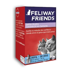 Refil com 48 mL para Feliway Friends Difusor Elétrico; Área de cobertura do difusor: 5070m2; Contribui para a harmonia entre gatos; Evita brigas, bloqueios e perseguições; Não possui contraindicação; Desenvolvido especialmente para gatos (Espécieespecífico); É inodoro, não sedativo e não tem efeito sob outros animais ou pessoas. Detalhes É da natureza felina ficarem sozinhos, quando percebem a presença de outros gatos se sentem ameaçados o que pode resultar em brigas entre eles. O Feliway Friends Ceva Refil é um análogo sintético do feromônio materno felino, tem como finalidade diminuir os conflitos, brigas e tensões entre gatos, promovendo sensação de bemestar, tranquilidade e uma convivência harmônica. Coloque Feliway Friends difusor na tomada, de preferência no ambiente onde os gatos ficam a maior parte do tempo. O difusor tem duração de 30 dias e deve ficar 24 horas por dia na tomada. Após 30 dias, troque o refil. Consulte sempre o médico Veterinário de sua confiança ou profissional habilitado para o uso apropriado deste produto.. Dispensa registro na ANVISA conforme decretolei número 467, de 13 de fevereiro de 1969.