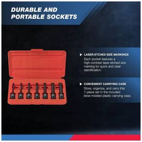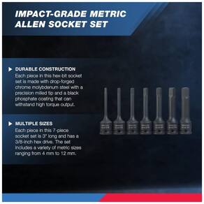 QUALIDADE PRO Conjunto completo de chaves Allen hexagonais métricas de 3, 8 de 7,6cm de comprimento para afrouxar e apertar parafusos e porcas resistentes GAMA LARGA DE TAMANHOS Um espectro completo de soquetes métricos de soquetes de driver hexagonal, incluindo 4, 5, 6, 7, 8, 10, CONSTRUÇÃO PESADA Feita de aço cromo vanádio forjado para maior resistência e durabilidade EXTRA LONGO Perfeito para mecânicos e eletricistas, o comprimento de três polegadas atinge lugares onde os soquetes de impacto de tamanho regular não IMPACTO PRONTO Os soquetes de 3, 8 estão prontos para impacto e oferecem alta resistência e torque. A construção de aço molibdênio de alta resistência e as pontas fresadas com precisão proporcionam desempenho premium com um ajuste exato na cabeça do fixador. Essas ferramentas foram projetadas para serem usadas com drivers de impacto para liberar parafusos enferrujados e apertados demais. O conjunto inclui Unidade de 3, 8 de polegada de 7 soquetes de impacto de driver hexagonal métrico 4, 5, 6, 7, 8, 10, . Estojo de zenamento e transporte incluído Marca: Não Informado