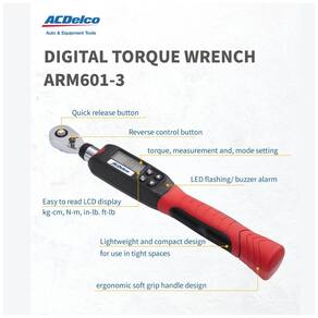 Tecnologia avançada faixa de torque de 1 a 16,7kg com alarme LED piscando , campainha quando o torque é atingido. Visor LCD de fácil leitura com medições kg cm, N m, pol lb ft lb Funções de configuração múltipla configurações de torque, medição e pico e rastreamento, modo. Faixa de ajuste de torque 10 do valor máximo de torque. Faixa de medição 2 a 37 pés lbs. Faixa de precisão garantida 2 no sentido horário 3 CCW do valor indicado, CW, de 20 a 100 de escala completa. Garantia de qualidade atende ou excede os padrões ASME B107.14 2004, ISO 6789, serializados individualmente com certificado de calibração correspondente rastreável para N.I.S.T. Funções padrão configuração de torque, configuração de medição, configuração de modo. A chave dinamométrica é provavelmente uma das ferramentas especializadas mais usadas quando se trata de trabalhos automotivos. A chave de torque digital ACDelco ARM601 3, 8 foi projetada para fornecer um torque mais preciso com várias configurações de modo. Essa chave dinamométrica possui uma campainha sonora embutida e visor LCD para mostrar suas configurações de medição pés lb, Nm, polegadas in, kg cm. Alimente facilmente esta ferramenta com três 3 pilhas AAA, tornando a muito leve e durável. Variando de 4 99 ft. lbs. Essa chave de torque digital é definitivamente um must have para carros. Características Funções padrão Configuração de torque, configuração de medição, configuração de modo. Opera tanto no sentido horário quanto no sentido anti horário. O LCD exibe medições de kg cm, Nm, in lb, ft lb. Confirmação audível de torque por meio de campainha. Fácil de configurar os modos de pico ou rastreamento 1, 2 polegada 99 pés lbs