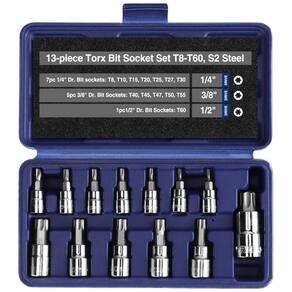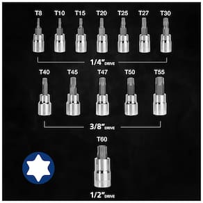Broca de aço S2 forjada a quente e tratada termicamente para torque, força e durabilidade. Os soquetes de vanádio cromado fornecem máxima resistência ao óleo e à corrosão. Atendem e excedem todas as especificações ANSI para maior segurança. Trabalho em carros, caminhões, eletrodomésticos, equipamentos para gramados, máquinas e outros trabalhos que exigem fixadores , parafusos , soquetes elétricos. Conjunto inclui soquetes Dr. Bit de 7pc 1, 4 T8, T10, T15, T20, T25, T27, 0 5pc 3, 8 Dr. Soquetes de bits T40, T45, T47, T50, T55 e 1pc1 , 2 Dr Soquetes de bits T60 Marca: Não Informado