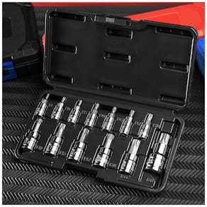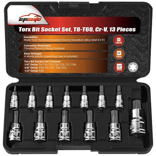 Durabilidade Feito de aço de liga de cromo vanádio tratado endurecido Cr V resistente à corrosão cromado e polido a espelho fácil zenamento inclui um estojo de plástico resistente. Conteúdo do conjunto de soquetes de bit Torx Unidade de 1, 4 T8, T10, T15, T20, T25, T27, 0 Unidade de 3, 8 T40, T45, T47, T50, T55 Unidade de 1, 2 T60 Marca: Não Informado