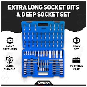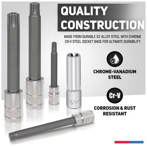 DURABILIDADE brocas de aço de liga S2 premium para dureza superior que reduzem o desgaste e garantem a longevidade. FORÇA DO TORQUE soquetes de aço cromo vanádio de alta resistência fornecem torque superior para maior poder de torneamento com acabamento cromado no espelho para resistência à corrosão. Bits DE PRECISÃO precisamente e pontas de brocas usinadas automaticamente para garantir o tamanho exato, as pontas de brocas chanfradas são inseridas suavemente nos prendedores e protegem as brocas e os prendedores de bordas danificadas brocas e soquetes de comprimento extralongo alcançam prendedores nos recessos mais profundos e no local mais apertado. ZENAMENTO ORGANIZADO o conjunto inclui um plástico resistente estojo de organização para zenamento e fácil transporte. INCLUI soquetes de 17 bits torx estrela de T6 a T70, soquetes de 17pcs torx à prova de adulteração de TT6 a TT70, soquetes de 12pcs torx mais bit de TP8 a TP60, soquetes de 14x torx externos de E4 a E24. As brocas de aço S2 premium oferecem resistência e durabilidade ideais para desaparafusar os parafusos intratáveis e as pontas das brocas são dimensionadas para um encaixe preciso. Os soquetes são feitos de cromo vanádio duradouro. O conjunto inclui soquete Torx externo profundo de 14 peças 5 peças. Unidade de 1, 4 pol. E4, E5, E6, E7, E8 de 5 peças. Unidade de 3, 8 pol. E10, E11, E12, E14, E16 4 peças. Unidade de 1, 2 pol. E18, E20, E22, E24 Soquete de bit Torx de 17 peças 10 peças. Unidade de 1, 4 pol. 2 3 , 4 pol. T6, T7, T8, T9, T10, T15, T20, T25, T27, 0 5 peças. Unidade de 3, 8 pol. 4 3 , 8 pol. T40, T45, T47, T50, T55 2 peças. Unidade de 1, 2 pol. 5 1 , 2 pol. T60, T70 Soquete de calcador Torx de 17 peças 10 peças. Unidade de 1, 4 pol. 2 3 , 4 pol. TT6, TT7, TT8, TT9, TT10, TT15, TT20, TT25, TT27, T0 de 5 peças. Unidade de 3, 8 pol. 4 3 , 8 pol. TT40, TT45, TT47, TT50, TT55 de 2 peças. Unidade de 1, 2 pol. 5 1 , 2 pol. TT60, TT70 Soquete de bit Torx Plus de 12 peças 7 peças. Unidade de 1, 4 pol. 2 3 , 4 pol. TP8, TP10, TP15, TP20, TP25, TP27, TP30 de 4 peças. Unidade de 3, 8 pol. 4 3 , 8 pol. TP40, TP45, TP47, TP50, TP55 1 peça. Unidade de 1, 2 pol. 5 1 , 2 pol. TP60. Estojo de zenamento e transporte incluído