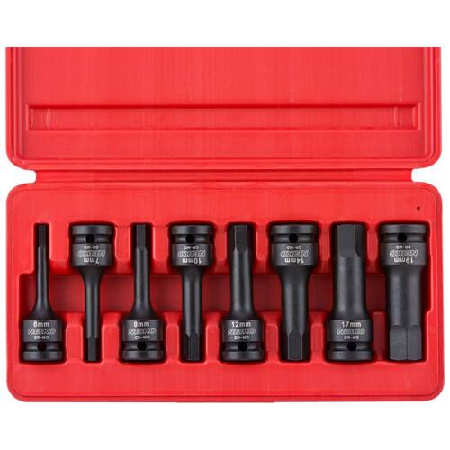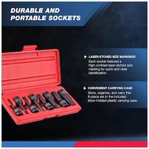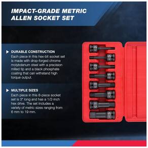 A construção robusta de uma peça e os soquetes sextavados e Allen são ideais para construção e uso automotivo comprimento de 7,5cm fornece alcance extra para espaços estreitos e apertados. Os soquetes são construídos em aço cromo molibdênio resistente com um revestimento de fosfato preto que resiste à corrosão e ferrugem. Projetado com um orifício para uso com sistemas de pinos e anéis para retenção segura do soquete. Equipado com um estojo portátil moldado por sopro para ótima organização e fácil deslocamento. Inclui soquetes de tamanho comum 6, 7, 8, 10, 12, 14, 17 e gravados a laser para facilitar a identificação. A construção de aço molibdênio de alta resistência e as pontas fresadas com precisão proporcionam desempenho premium com um ajuste exato na cabeça do fixador. Essas ferramentas foram projetadas para serem usadas com drivers de impacto para liberar parafusos enferrujados e apertados demais. O conjunto inclui Soquete de impacto de driver hexagonal de 8 peças e 1, 2 polegada métrico 6, 7, 8, 10, 12, 14, 17, . Estojo de zenamento e transporte incluído Marca: Não Informado