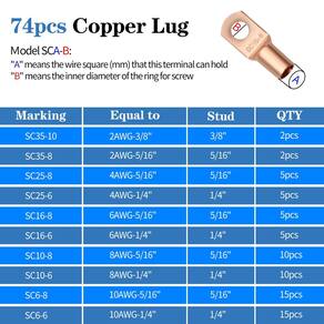 Ferramenta de crimpagem de terminais de cabo: Material: metal Molde da ferramenta de crimpagem: AWG 10, 8, 6, 4, 2, 1/0 Peso da embalagem: 1,7 kg 74 argolas de cobre: SC6-6 (15 peças), SC6-8 (15 peças) SC10-6 (10 peças), SC10-8 (10 peças) SC16-6 (5 peças), SC16-8 (5 peças) SC25-6 (5 peças), SC25-8 (5 peças) SC35-8 (2 peças), SC35-10 (2 peças) 100 tubos termorretráteis: F1/10.2 cm (40 peças), F3/20.3 cm (40 peças), F1/5.1 cm (20 peças) Conteúdo da embalagem: 1 x ferramenta de crimpagem de cabo 74 x terminais de fio de cobre. 100 tubos termorretráteis. - ?Incluído na embalagem? - O pacote inclui 1 ferramenta de crimpagem de talão de cabo, 74 terminais de fio de cobre e 100 tubos termorretráteis. - ?Molde de crimpagem rotativo?- A ferramenta de crimpagem de cabo está disponível em 6 tamanhos de crimpagem: AWG 10, 8, 6, 4, 2 e 1/0 (semelhante a 6mm²/10mm²/16mm²/25mm²/35mm²/50mm²). - ?Material de alta qualidade?- Os terminais do fio de cobre são feitos de cobre de grau eletrolítico para alcançar a máxima condutividade. O tubo termorretrátil é feito de material de polietileno de alta qualidade, espesso e durável. - ?Design ergonômico?- A alça do dispositivo de crimpagem tem até 25 cm de comprimento e é envolta com borracha macia. O design ergonômico da estrutura da alavanca pode aumentar o atrito e economizar mais trabalho ao crimpar. - ?Ampla aplicação?- Estes terminais são adequados para caixas de distribuição, navios, carrinhos de golfe, painéis solares, aplicações domésticas e muito mais. Também é amplamente utilizado em veículos, motocicletas, barcos e fios DIY.