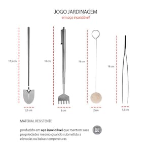 Jogo de mini ferramentas para jardinagem peças produzidas em aço inoxidavel. As ferramentas pequenas sao perfeitas para jardinagem de casa ou apartamento e manejo de plantas de pequeno porte, como cactos, bonsai e suculentas. Cada peça possui funçao propria, sendo o ancinho, ajustavel ate 41cm, e perfeito para nivelar e mover substrato em espacos dificeis de alcancar. A pinça facilita a remoçao de detritos e o ajuste de plantas em cantos estreitos, garantindo um manuseio preciso. A pa excelente para compactar o solo e adicionar camadas de musgo e areia. Ja o espanador e ideal para limpar poeira e sujeira em folhas frageis ou no vidro do terrario. Contem: 1 Pinça Medidas: 18 x 1,5 cm 1 Pá Medidas: 17,5 x 2,5 cm 1 Espanador Medidas: 16 x 2 cm 1 Ancinho Medidas: 16 x 3 cm Material: Aço Inox