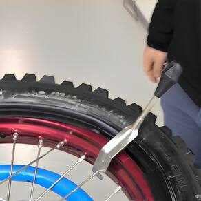 A Ferramenta mantém o talão do pneu pressionado no centro rebaixado do aro (vala), facilitando a instalação do restante do pneu no lado oposto.